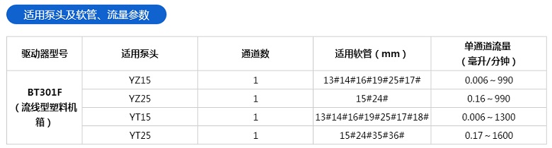 BT301F分配型智能蠕動(dòng)泵流量范圍0.006~1600毫升/分鐘。采用彩色液晶和觸摸屏技術(shù),操作界面簡(jiǎn)單,直觀,明了。主要適用于各種復(fù)雜的液體定量分配,適用于精確計(jì)量和定量給料,可以實(shí)現(xiàn)高精度的流量傳輸控制。對(duì)液量分裝精度要求高時(shí),使用液量分配模式更加方便;對(duì)產(chǎn)量要求高時(shí),使用時(shí)間分配模式更加方便;需要將一定液體分裝為若干份液體時(shí)請(qǐng)使用復(fù)制分配模式。設(shè)置為流量模式時(shí),完全等同于一臺(tái)流量型蠕動(dòng)泵。為了減小不必要的風(fēng)扇噪音,采用了智能溫控技術(shù)。在RS485通訊中,因?yàn)椴捎昧薓ODBUS協(xié)議,更易于與其他控制設(shè)備如計(jì)算機(jī),人機(jī)界面,PLC等連接。