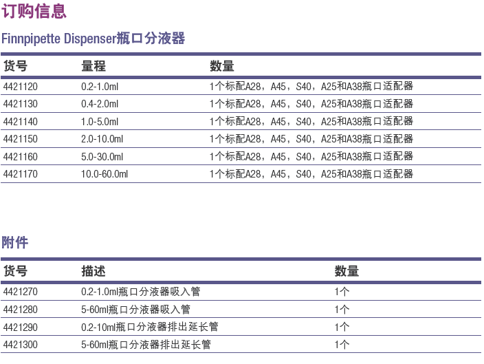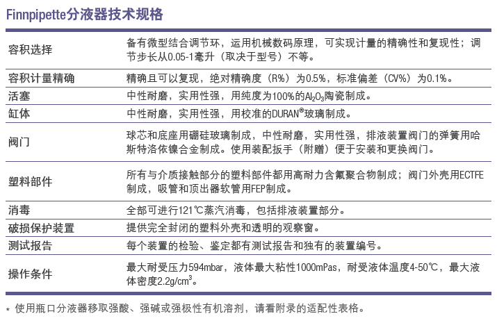 Thermo Scientific Finnpipette瓶口分液器可分裝任意體積的液體,6種型號覆蓋了0.2ml-60ml的分裝體積。分裝精確、穩(wěn)定、復現(xiàn)性好。