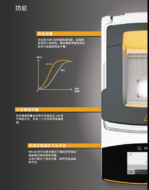新型 MA160 設(shè)計(jì)用于需要快速、高重復(fù)性水分分析結(jié)果的實(shí)驗(yàn)室及 QC 實(shí)驗(yàn)室,可對(duì)不同產(chǎn)品的不同方法以及不同設(shè)備之間的方法轉(zhuǎn)換進(jìn)行管理。MA160 確保簡便方法的開發(fā)與管理,以及簡單的樣品操作和儀器性能的測(cè)試。人體工程學(xué)的“更易清潔”設(shè)計(jì)將操作者從繁瑣的清潔中釋放出來,其狀態(tài)燈則可便捷地指示每一個(gè)分析步驟的進(jìn)度。