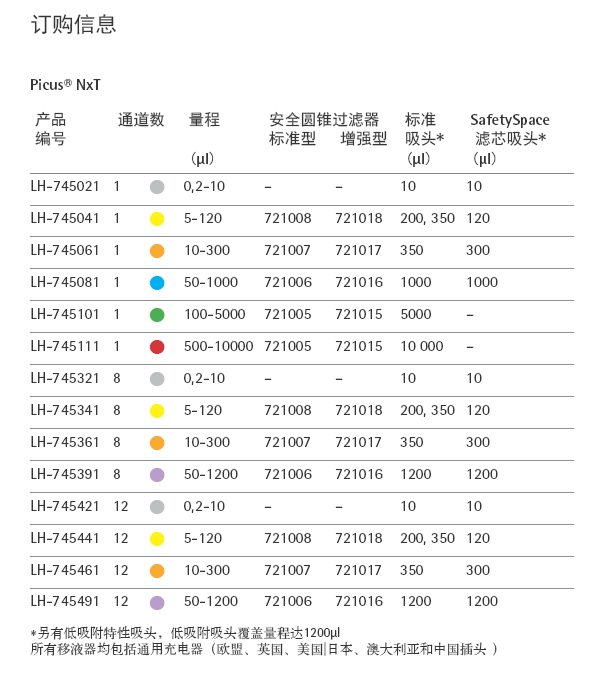 - 單道型號量程覆蓋從0.2 µl – 10,000 µl,多道型號量程從0.2 µl – 1,200 µl。