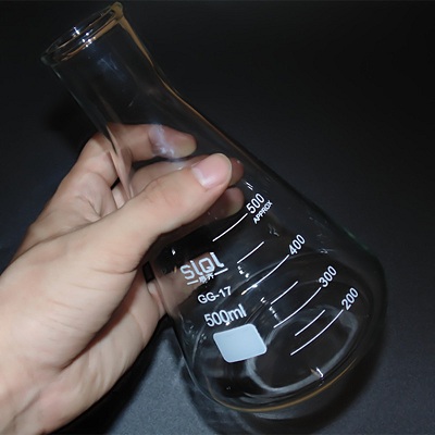 錐形瓶(beakerflask)一種化學(xué)實(shí)驗(yàn)室常見的玻璃儀器。是硬質(zhì)玻璃制成的縱剖面呈三角形狀的滴定反應(yīng)器?谛、底大,有利于滴定過程進(jìn)行振蕩時(shí),反應(yīng)充分而液體不易濺出。該容器可以在水浴或電爐上加熱。外觀呈平底圓錐狀,下闊上狹,有一圓柱形頸部,上方有一較頸部闊的開口,有時(shí)可用由軟木或橡膠制作成的塞子封閉。瓶身上多有數(shù)個(gè)刻度,以標(biāo)示所能盛載的容量。