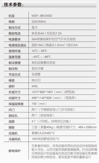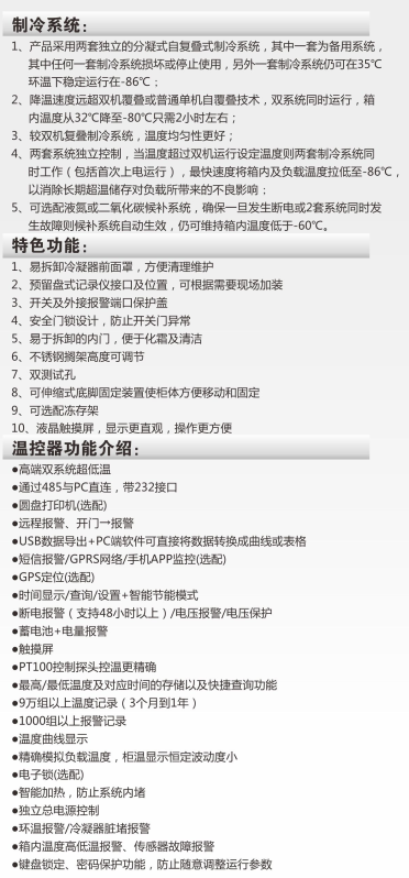 箱內(nèi)溫度從32℃降至-80℃只需2小時(shí),冰箱箱內(nèi)溫度最低可達(dá)-86℃