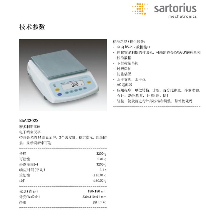 首頁 > 實驗室通用分析檢測儀器 > 天平和砝碼 > 德國賽多利斯 > 精密天平0.001/0.01/0.1g > 賽多利斯BSA3202S天平,0.01g/3200g,賽多利斯天平