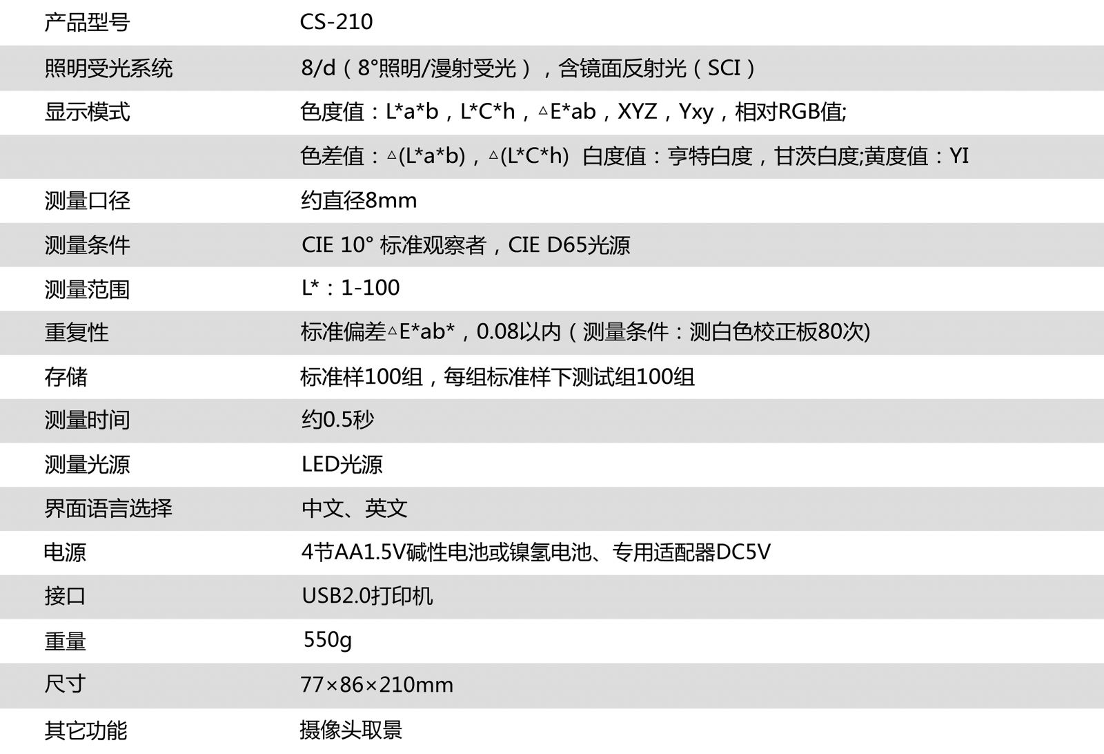 CS-210精密色差儀,廣泛應(yīng)用于塑膠、印刷、油漆油墨、紡織、印染服裝等行業(yè)的顏色管理領(lǐng)域,根據(jù)CIE色空間測(cè)量樣品色值L*a*b、L*c*h,與被測(cè)樣品的色差△E以及 △Lab值。