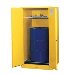 黃色立式圓桶存儲柜,55加侖/200升,單門/手動,帶滾柱
