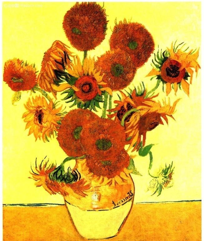 凡·高最有名的作品無(wú)疑是這幅《向日葵》。他曾多次描繪以向日葵為主題的靜物,他愛(ài)用向日葵來(lái)布置他在阿爾的房間。他曾說(shuō)過(guò):“我想畫上半打的《向日葵》來(lái)裝飾我的畫室,讓純凈的或調(diào)和的鉻黃,在各種不同的背景上,在各種程度的藍(lán)色底子上,從最淡的維羅內(nèi)塞的藍(lán)色到最高級(jí)的藍(lán)色,閃閃發(fā)光;我要給這些畫配上最精致的涂成橙黃色的畫框,就像哥特式教堂里的彩繪玻璃一樣!狈病じ叽_實(shí)做到了讓阿爾八月陽(yáng)光的色彩在畫面上大放光芒,這些色彩熾熱的陽(yáng)光,發(fā)自內(nèi)心虔誠(chéng)的敬神情感。