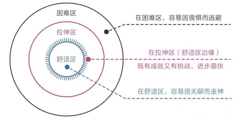 2、三圈理論:它揭示了能力成長的普遍法制:無論個體還是群體,其能力都以“舒適區(qū) ——>拉伸區(qū) ——>困難區(qū) ”的形式分布,想要讓自己高效成長,必須讓自己始終處于舒適區(qū)邊緣,貿(mào)然跨到困難區(qū)去會讓自己受挫。而始終停留在舒適區(qū)會讓自己停止不前。但是人的天性和這個規(guī)律相反,在欲望上急于求成,在行動上避難趨易。如果總是停留在舒適區(qū),將導(dǎo)致自己在現(xiàn)實中一無所獲。我們需要讓自己始終待在舒適區(qū)邊緣才行。